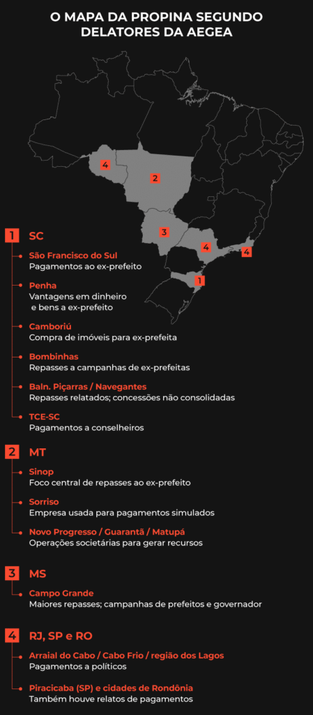 Em Santa Catarina, por exemplo, delatores mencionaram influência sobre integrantes do Tribunal de Contas estadual e repasses milionários a agentes políticos. Os citados negam as acusações, classificando as declarações como falsas ou distorcidas.