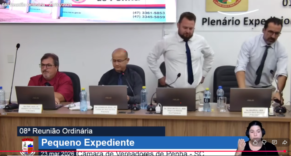 A sessão ordinária da Câmara de Vereadores de Penha realizada na noite desta segunda-feira (23) foi marcada por tensão, interrupções e um desfecho antecipado. Em menos de uma hora de reunião, o presidente da Casa, Luciano de Jesus, suspendeu os trabalhos em dois momentos e, após a leitura de um requerimento assinado por diversos vereadores pedindo sua destituição do cargo e afastamento da função, decidiu encerrar a sessão. O documento, que ganhou força no plenário, foi ignorado pelo presidente, que se apoiou em dispositivos do regimento interno — entre eles a inexistência formal da Comissão de Ética, ainda não instaurada — para justificar a impossibilidade de dar andamento ao pedido naquele momento. O requerimento ainda não foi disponibilizado no site oficial.